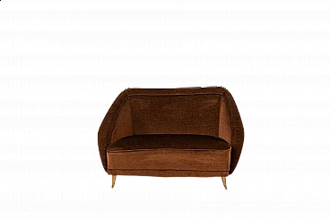 Bellissimo divano in velluto marrone disegnato da Guglielmo Veronesi per la raffinata fabbrica Isa Bergamo, realizzato negli anni '50. Il divano ha una forma smussata e moderna, lo schienale è più fastoso, i braccioli sono anch'essi in velluto e continuano la forma dello schienale sinuoso. La poltrona è sostenuta da 4 gambe in ottone, in perfetta patina. Volendo, c'è la possibilità di completare il set con poltrone abbinate.