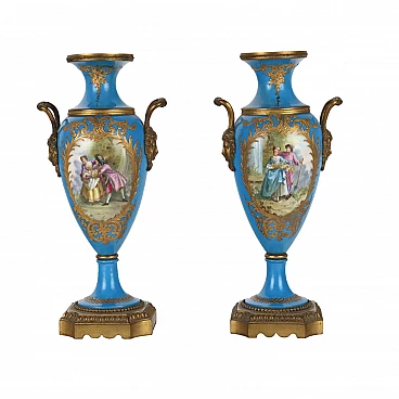 Coppia di vasi in porcellana e bronzo dorato con decori in oro a motivi vegetali. Nelle riserve dipinti con scene galanti e paesaggi. Sotto la base si intravede il marchio della manifattura.