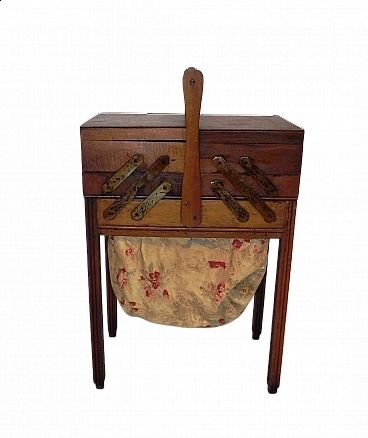 Scatola da cucito anni 70 con 5 scomparti apribili e portagomitoli apribile nella parte sotto, incluso fuso in legno. Struttura in legno, compassi in metallo. Tutto funzionante ed intatto, presenza di vecchi fori di tarlo. Trattamento antitarlo eseguito. Spedizione con imballo adeguato.