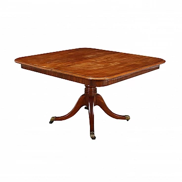 Tavolo vittoriano in mogano, Inghilterra fine XIX secolo. Basamento tornito e gambe mosse terminanti con piedi e ruote in ottone.