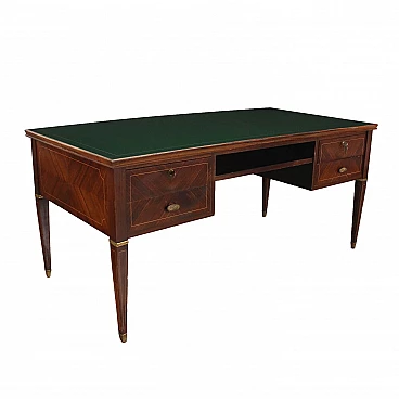 Scrivania con doppia colonna cassetti e vano a giorno sotto piano. Legno impiallacciato palissandro, filettatura decorativa intarsiata, particolari in ottone, piano in vetro retro trattato.