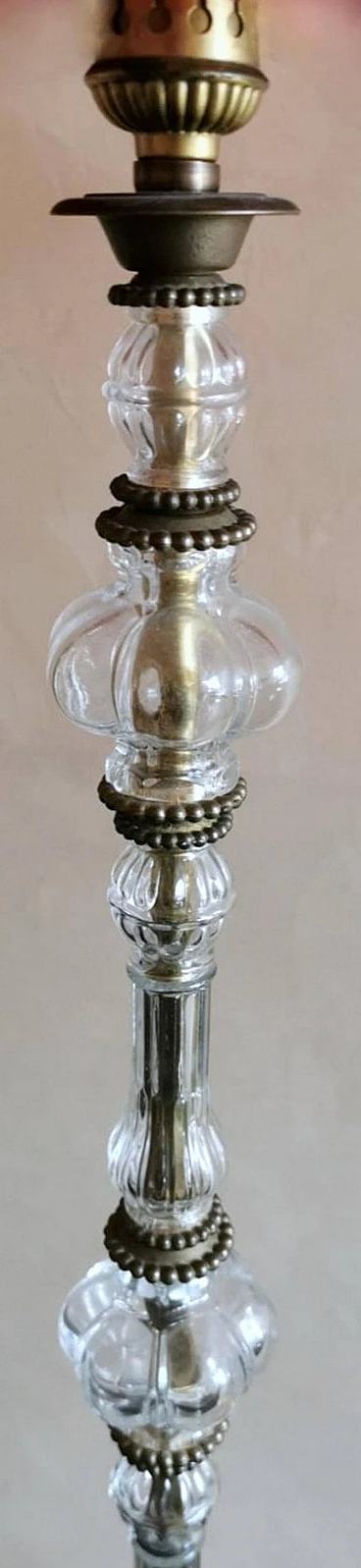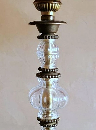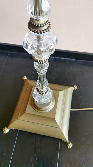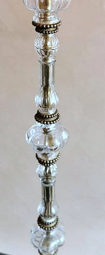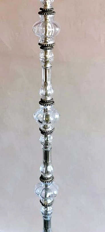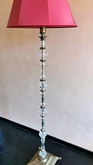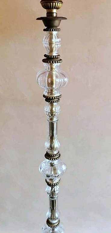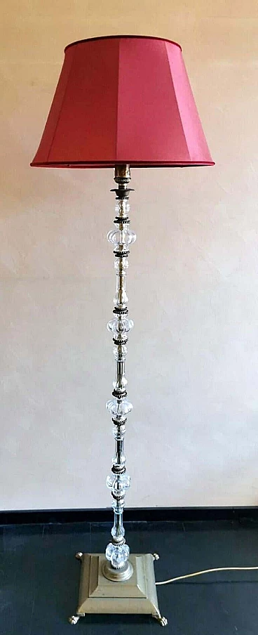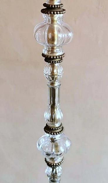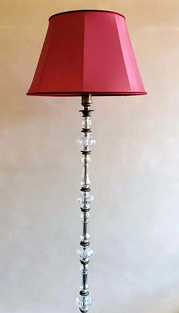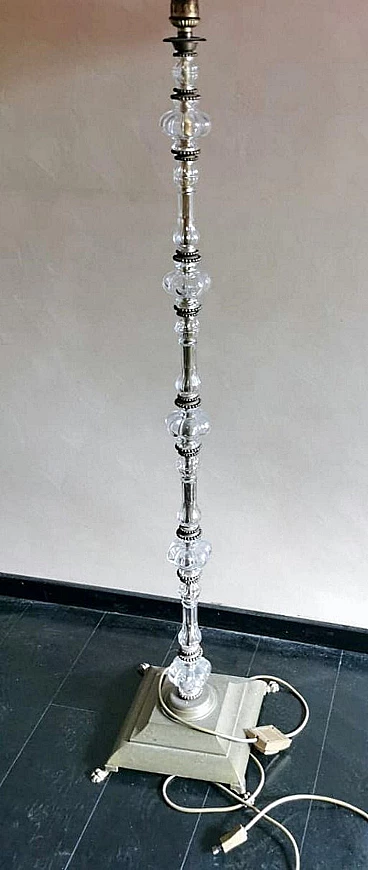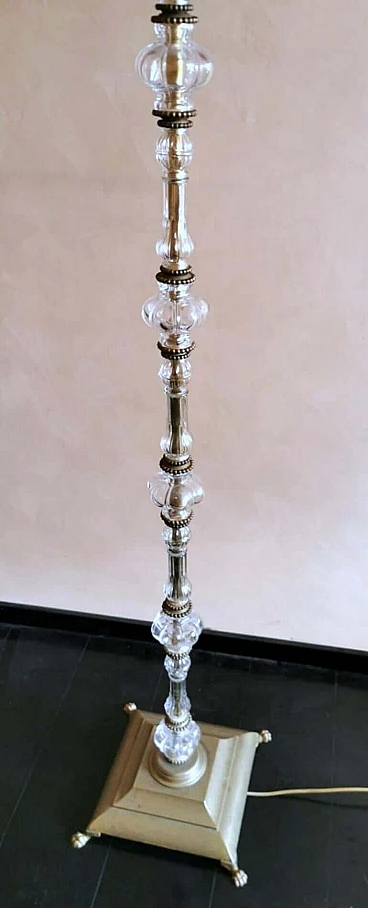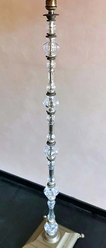 Le foto con i paralumi sono solo esplicative. Magnifica, elegante e imponente lampada da terra francese; lo stelo è composto da raffinati elementi in vetro soffiato a mano intervallati da raffinate decorazioni a pallini in ottone; la solida base quadrata è in ottone con piedi a zampa di leone; l'accensione è a pulsante da terra; I vari pezzi sono stati poi assemblati, creando lo stelo, con eccezionale gusto estetico, studiandone il posizionamento per sfruttare la luce e le rifrazioni dei cristalli; nel complesso lunghe e delicate operazioni che hanno reso possibile la magnificenza di questa lampada. La lampada è stata realizzata tra il 1947 e il 1949 in un laboratorio artigianale nella zona tra la Mosella e i Vosgi (Francia) dove aziende famose come Meisenthal, Lemberg, Potyruc, Baccarat, Valle le Chatel, e Sant-Louis-lès Bitche hanno creato la magia del cristallo e del vetro portando al mondo un'immagine di raffinata bellezza. La lampada viene fornita senza paralume in modo che ognuno possa scegliere il colore in modo personale per abbinarlo al proprio arredamento. L'impianto elettrico è nuovo ma il cablaggio è europeo, la compatibilità della tensione in altri stati deve essere sempre verificata da un elettricista prima dell'uso.