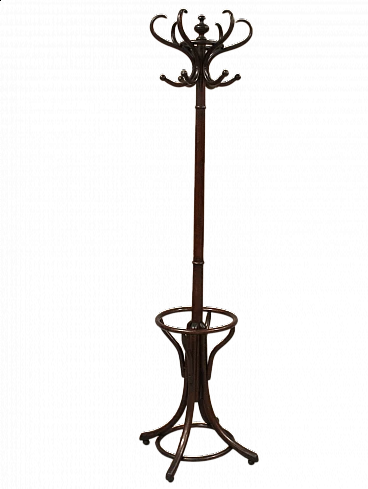Attaccapanni a piantana tipo Thonet in legno massello. Epoca metà '900. In buone condizioni (vedere foto). Sulle reali condizioni dell'oggetto valutare le fotografie in quanto hanno valore prioritario e non discutibile. Rilasciamo Certificato di Autenticità. Misure: 43 cm x 43 cm , altezza 191 cm