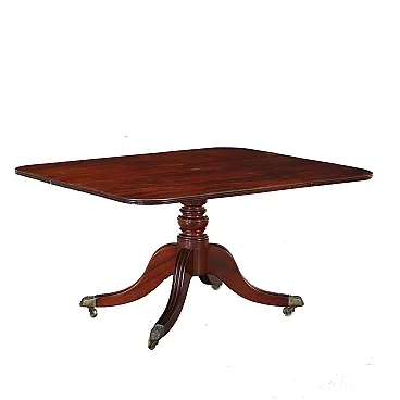 Tavolo inglese sorretto da un balaustro centrale dotato di quattro gambe mosse terminanti con scarpette e rotelle in ottone; in mogano, il piano è smontabile con sistema a chiavette.