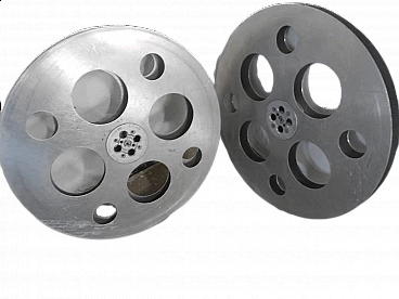 Bobine da cinema in alluminio degli anni '60. In buone condizioni. Si possono usare come elementi decorativi da parete per case o locali. Disp pz 2