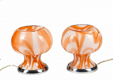 Coppia di lampade in stile Carlo Moretti, in vetro color arancione con striature bianche, con base in metallo cromato. Funzionanti.