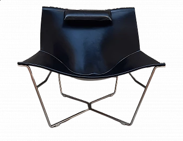 Elegante poltrona in cuoio nero con poggiatesta in pelle telaio in acciaio con protezioni in plastica per il pavimento. Molto comoda ed in eccellenti condizioni.