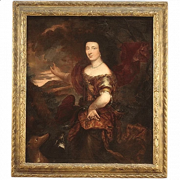 Antico dipinto francese del XVII secolo. Opera olio su tela raffigurante ritratto di Nobildonna nelle vesti della dea Diana con favolosi cani da caccia di ottima mano pittorica. Cornice antica, non coeva, finemente scolpita, cesellata e dorata (vedi foto) di bella decorazione. Quadro di grande misura e impatto piacevolmente rifinito nei minimi particolari (vedi foto) per antiquari, arredatori e collezionisti di ritratti antichi. Dama in posa di forte personalità e grande carattere rappresentata con decori di perle e freccia nella mano sinistra (vedi foto). Opera che ha subito un intervento di restauro conservativo, rintelo, sostituzione del telaio e ripresa del colore in diversi punti (vedi foto). In buone condizioni con qualche segno del restauro. Luce dipinto H 129 x L 110 cm.