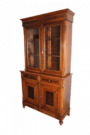 Antica credenza vetrina con doppio corpo toscana epoca XIX secolo, in essenza di noce. Parte superiore a vetri con ripiani interni, parti inferiore a sportelli con ripiano realizzato in doppia essenza noce chiaro e scuro. Montanti intagliati con foglie ai lati. Perfettamente restaurata.