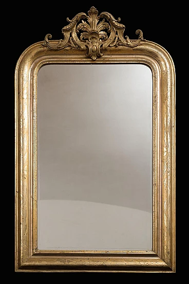 Elegante specchiera Francese della seconda metà del 800 interamente scolpita, intagliata e dorata a foglia oro. La specchiera si presenta come un intaglio di legno sulla cimasa dove è possibile apprezzare tutta la sua finezza. Lo specchio è coevo alla cornice in legno. Provenienza: Francia XIX secolo. Condizioni Generali: Ottimo stato Misure: 90x160H. Documento: Certificato di Autenticità.