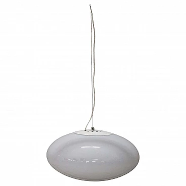 Bellissimo lampadario a sospensione design italiano in vetro bianco anni 1950 una luce interna. Stilnovo modello UFO. Completamente funzionante. L'altezza indicata è massima ma è possibile regolarla. L'altezza della sola coppa di vetro è di 23 cm. Ottime condizioni. Vi consigliamo di guardare bene in dettaglio tutte le foto.
