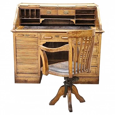 Bellisima scrivania antica in legno di rovere grandi dimensioni con poltrona originale epoca art deco primi decenni del 1900. La scrivania presenta tipica chiusura del piano a serrandina così come la parte in basso sulla sinistra. Ai lati inoltre sono presenti due ripiani estraibili da usare all'occorrenza. Rifinita su ogni lato perciò perfetta per essere messa anche a centro stanza. Maniglie dei cassetti realizzate in rovere. Ampio spazio utile sia per la scrittura che per la capacità dei vari cassetti. Scrivania di grande importanza. La scrivania è usata presenta segni di usura a livello di finitura guardare con attenzione tutte le foto. La funzionalità della serrandina è buona. Proposto ad un'ottimo prezzo ancora trattabile inviate pure la vostra proposta d'acquisto