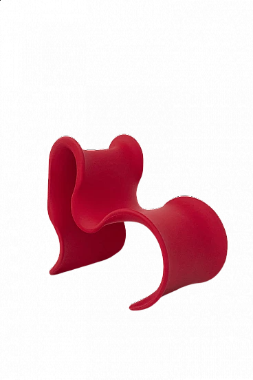 Poltrona Fiocco prodotta da Busnelli, nata nel 1970 dal disegno di Gianni Pareschi. La struttura è in tubolare metallico ed è ricoperta da una guaina di poliuretano espanso, è calibrata per tenere in tensione il rivestimento in elatex su cui sdraiarsi e farsi coccolare. La poltrona di Gianni Pareschi è molto pratica, perché è facilmente sfoderabile. Un mix perfetto di essenzialità, originalità e tecnologia. Altezza della seduta: 60cm. Ottime condizioni, è stata rifoderata in un colore rosso molto attraente.