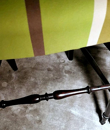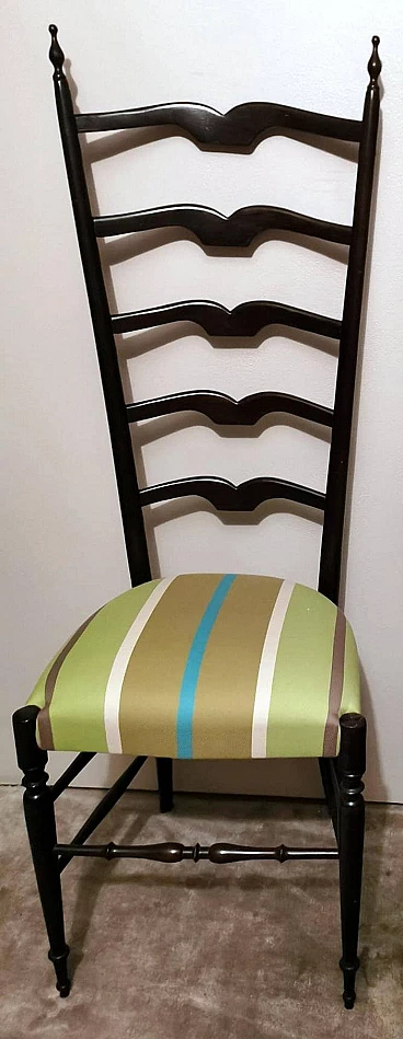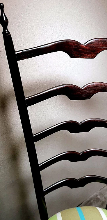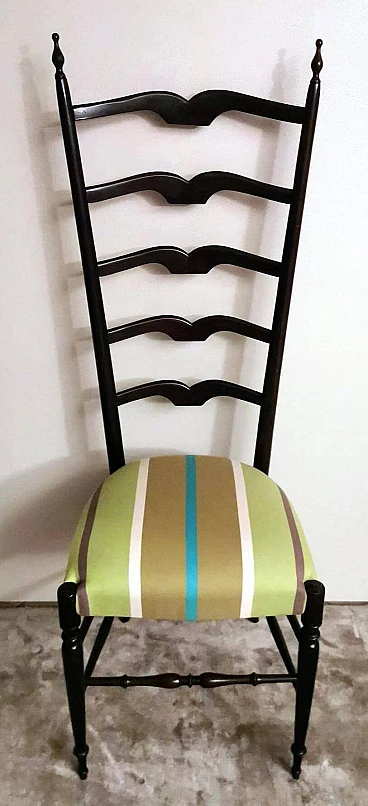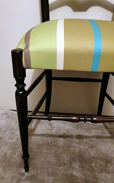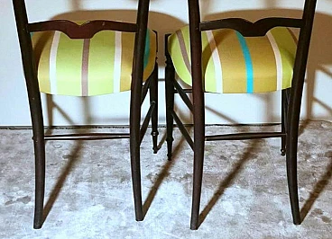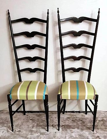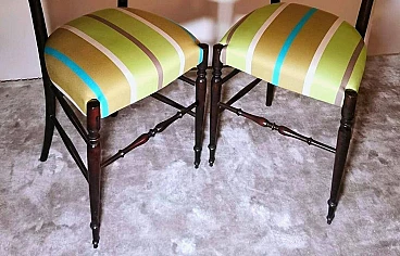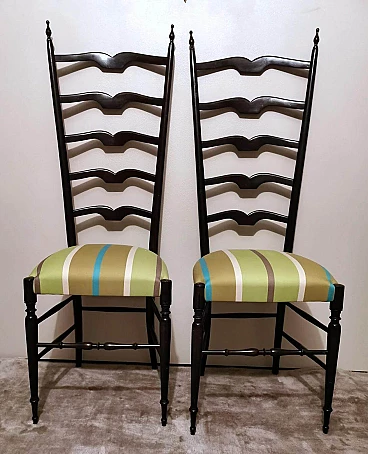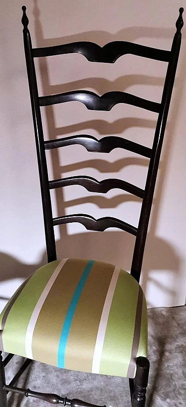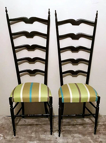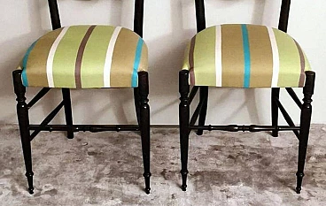 Squisita, iconica e famosa coppia di sedie italiane da ingresso laterale; sono caratterizzate dalla linea pulita, essenziale e raffinata, sono il modello esclusivo della produzione di Chiavari (Italia) con dettagli artigianali di grande pregio e mostrano la struttura e il tipico intaglio con l'attacco tornito a rinforzare le esili gambe; la seduta è rivestita con un originale e multicolore tessuto di ottimo cotone. Sono state realizzate tra il 1950 e il 1955 da abili artigiani della città di Chiavari (Italia) che si sono ispirati allo stile del famoso designer italiano Paolo Buffa. Gli artigiani hanno seguito fedelmente la tecnica di produzione vecchia di due secoli; hanno scelto il legno nei boschi dell'entroterra ligure (faggio), tagliandolo tenendo conto di precise caratteristiche come il periodo stagionale e la fase lunare, a questo punto viene effettuata la stagionatura in modo strettamente naturale, per la quale sono necessari dai due ai cinque anni; La vera lavorazione può iniziare solo quando il legno viene essiccato alla perfezione e viene eseguita con macchinari manuali, alcuni componenti vengono invece torniti a mano con un grado di finitura ineguagliabile da qualsiasi macchinario industriale e infine le sedie vengono meticolosamente rifinite a mano fino ad eliminare anche la più piccola imperfezione. Il prodotto finito è il risultato di queste indiscutibili qualità, un'espressione d'arte che unisce eleganza, leggerezza, finitura perfetta e una sorprendente robustezza garantita. Una curiosità: Gli artigiani di Chiavari affermano che una delle loro sedie può essere sollevata solo con il mignolo e allo stesso tempo può essere usata quotidianamente senza alcun timore. A Chiavari, una buona scuola di artigiani del mobile era già fiorente nel periodo d'oro della Repubblica di Genova. La storia delle "sedie artistiche di Chiavari" inizia nel 1796 quando la sfida per la ricerca di nuove forme fu lanciata dalla Società Economica (un gruppo di nobili intellettuali) ai mobilieri della città. Queste prime sedie furono create, all'inizio del 1800, da Gaetano Descalzi, chiamate "il Campanino", nome che ancora oggi identifica il modello più antico da cui si è sviluppata la tipologia chiavarina. Nascono così le sedie conosciute in tutto il mondo per la loro forma essenziale, legata alla caratteristica leggerezza e resistenza. I più importanti designer italiani furono influenzati e realizzarono prototipi a Chiavari, Paolo Buffa, Guglielmo Ulrich e Gio Ponti. Gli ultimi due continuarono le produzioni in Brianza. Paolo Buffa (nato nel 1903, Milano - morto nel 1970, Milano) è stato un designer di mobili italiano che ha definito la sua estetica di design unica per diventare uno dei designer italiani più richiesti del suo tempo. Buffa eccelleva nel creare pezzi di alta qualità che parlavano alla clientela benestante del tempo. Le sedie sono in buone condizioni. Misure larghezza cm.43, profondità cm.38, altezza cm.125.