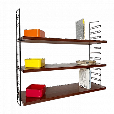 Libreria scaffale componibile da muro. Epoca: anni ’50. Materiale: teak, legno, tondino metallo laccato nero. Provenienza: Italia. Può presentare segni e usura dovuti al tempo, può aver subito un precedente restauro Misure: 83,5 x 24,5 h 78 cm