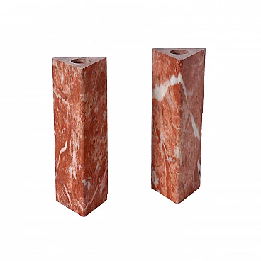Coppia di vasetti monofiore in marmo rosso a forma triangolare. Produzione Danese Milano, designer Enzo Mari. Marchio della manifattura sotto la base.