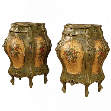 Coppia comodini veneziani della prima metà del XX secolo. Mobili di favolosa qualità e forma in legno riccamente scolpito, laccato e dipinto a mano con decori floreali. Comodini mossi e bombati per antiquari, arredatori e collezionisti mobili veneziani. Mobiletti muniti di un cassetto e un'anta, di buona capacità, piano superiore ligneo in carattere con qualche segno di usura e alcune cadute di colore (vedi foto). Comodini ideali da inserire in una camera o salotto, di strepitoso arredamento, arricchiti da decori in rilievo su fronte e fianchi. Mobili veneziani di difficile reperibilità, in bella patina con qualche segno del tempo (vedi foto). Strutturalmente sani, nel complesso in buono stato conservativo.