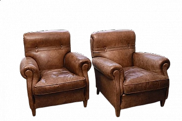 Coppia di poltrone Frau modello Romance, prodotte negli anni '50. Tutto in pelle marrone, con piedi in legno. Rivestimento in ottime condizioni, pelle in buone condizioni.
