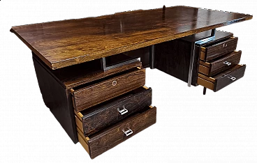 Scrivania di grandi dimensioni, in legno e metallo, anni '60. Struttura leggera, dotata di 6 cassetti e piano molto ampio. E' in buoni condizioni, ma con segni di usura dovuti al tempo.