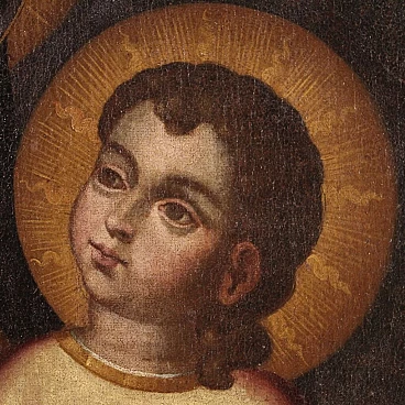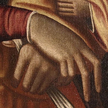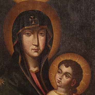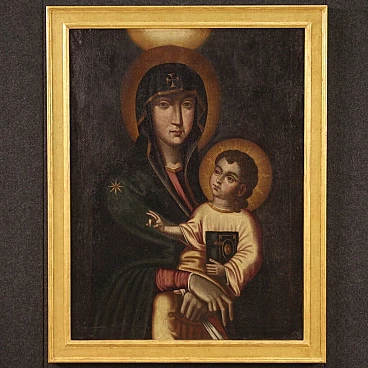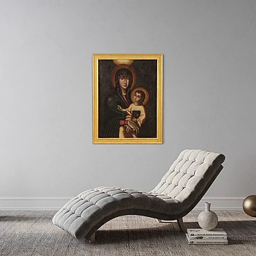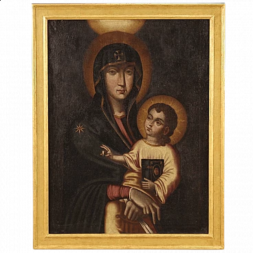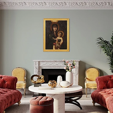 Dipinto italiano della fine del XIX / inizio XX secolo. Opera olio su tela raffigurante Madonna con bambino in stile antico Bizantino di buona mano pittorica. Cornice lignea del XX secolo, scolpita e dorata, di bella decorazione. Quadro di grande misura e impatto, per antiquari, arredatori e collezionisti di arte sacra. Tela che presenta sulle vesti della Madonna (al centro verso sinistra) due piccoli fori / cadute di colore (vedi foto) facilmente restaurabili. Dipinto di grande intensità pittorica e carattere, ideale da inserire in un salone o studio. Quadro che ha subito un intervento di restauro conservativo con ripresa del colore in alcuni punti nel corso del XX secolo. In buone condizioni con qualche segno del tempo. Luce dipinto H 99 x L 74 cm.