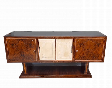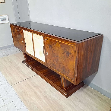 Magnifica credenza art deco razionalista italiana originale del 1930-40 circa, mobile di altissima qualità costruttiva, completamente rivestito in noce fiammata , radica e sportelli scorrevoli centrali in pergamena, il vano bar centrale è rifinito in noce e arricchito da uno specchio e un ripiano in vetro. Restaurata e lucidata a gommalacca in maniera professionale prima di essere proposta invendita , piano in vetro opalina nero originale dell' epoca.