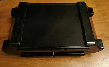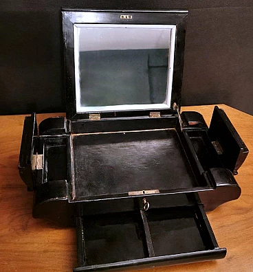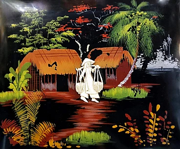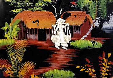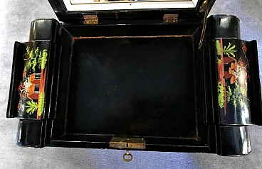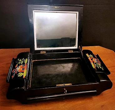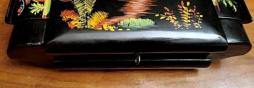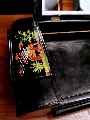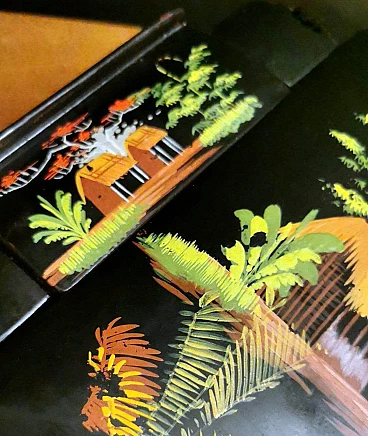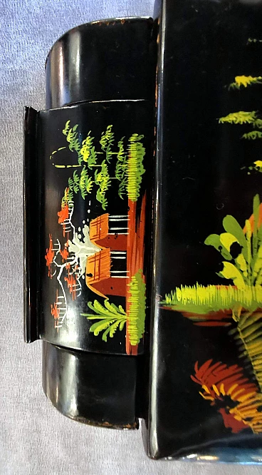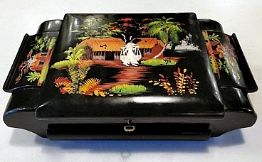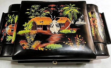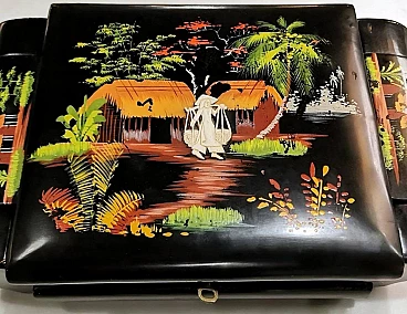 Pregevole ed originale scatola da toilette cinese, è stata realizzata in legno, poi ricoperta con la tecnica e l'arte della laccatura, all'interno vi sono diversi scomparti, uno centrale molto grande e altri due laterali piccoli dotati di coperchi incernierati, sotto la scatola vi è un comodo cassetto, nella parte interna del coperchio centrale è stato posto uno specchio che completa l'estrema versatilità ed utilità della scatola. La parte superiore della scatola rappresenta un piacevole e grazioso paesaggio della campagna cinese con piante e arbusti tipici; al centro, in rilievo, è stata posta la sagoma di un portatore di cesti di rattan che indossa il "sugegasa", tradizionale cappello a forma di cono dei contadini cinesi, il tutto è stato decorato a mano con colori vivaci da un abile artista e pittore che ha eseguito la rappresentazione con meticolosità e perizia curando l'intero lavoro nei minimi dettagli. Questa rara scatola è stata realizzata interamente a mano tra il 1949 e il 1951 in un laboratorio della città di Changsha nello Hunan, uno dei più importanti centri di produzione della lacca in Cina. L'arte della lacca è tipica dell'Estremo Oriente, e della Cina in particolare, dove già in tempi molto antichi fu scoperta la possibilità di utilizzare la preziosa resina prodotta dall'albero chiamato albero della lacca, Rhus vernicifera. Il suo complesso processo richiede molto tempo e una cura meticolosa, ma alla fine è possibile ottenere manufatti di grande bellezza e straordinaria perfezione. La tecnica e l'arte della lacca, insieme alla seta e alla porcellana, costituiscono uno dei maggiori contributi della Cina all'arte universale. Per venticinque secoli, le lacche in Cina sono state considerate oggetti artistici e di lusso. Venivano realizzate dopo una lunga serie di operazioni lente, meticolose e complicate, che coinvolgevano, uno dopo l'altro, una dozzina di artigiani e artisti. Gli oggetti, di solito in legno, vengono accuratamente preparati per la laccatura con uno strato di carta finissima, poi lasciati asciugare e accuratamente levigati con la pomice, e infine ricoperti con diversi strati di lacca e lasciati asciugare lentamente in un ambiente umido e buio, protetti dalla polvere, poi accuratamente levigati. L'oggetto così pazientemente preparato è finalmente pronto per l'operazione finale di decorazione; questa può essere fatta a pennello, usando la stessa lacca con aggiunta di pigmenti colorati. La nostra scatola, realizzata con tutte queste tecniche uniche e antiche che sono rimaste immutate nei secoli fino ad oggi, è un esempio di squisita bellezza e superba qualità. La scatola è in buone condizioni, all'interno c'è qualche imperfezione, ottime le condizioni della pittura. Misure lunghezza cm34, profondità cm.21, altezza cm.10.