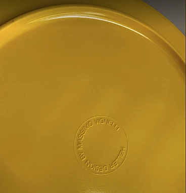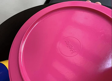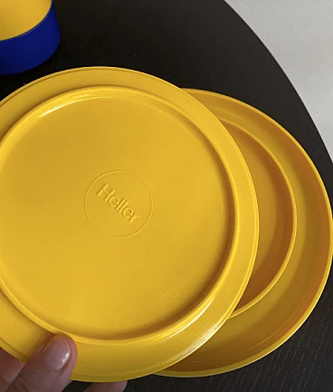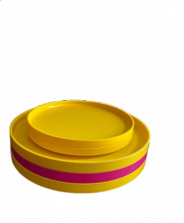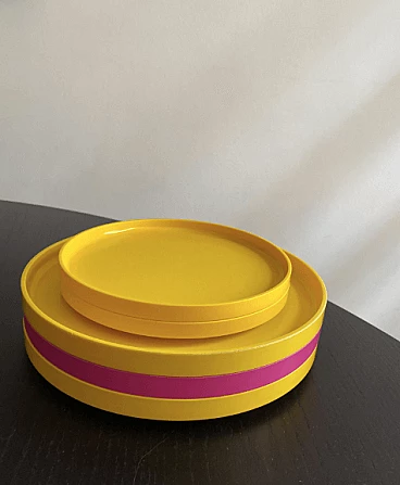 Set di piatti impilabili in melamina gialla e rosa disegnate da Massimo Vignelli per Heller, anni '80.