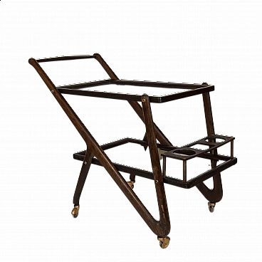 Carrellino porta bevande dagli anni 50. Designer Cesare Lacca. Doppio ripiano in vetro su struttura in legno ricurvo. Porta bottiglie in legno e rotelline in acciaio. In buone condizioni con piccoli segni del tempo. Struttura pulita e lucidata.