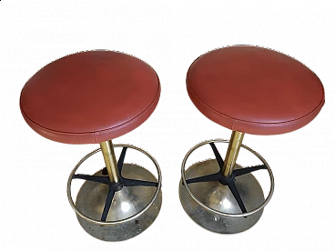 BUSNELLI 2 SgabellI BIG WINE BAR del 1989 by studio Centro Studi & Ricerche BUSNELLI Due bellissimi e rari sgabelli imbottiti, ad altezza regolabile, prodotti nel 1989 dalla BUSNELLI . Struttura verticale in tubolare in acciaio cromato oro da 5 cm con seduta in pelle di concia Toscana Bordeaux. Sedute morbide, grandi e molto comode, come pochi modelli. Base circolare da 46 cm a campana con poggia piedi a 4 razze in metallo nero. Imbottitura morbida in espanso, con rivestimento in pelle. Spessore della seduta altezza 10 cm. Sedute di alta qualità artigianale e di raffinato design. Produzione Italiana Forma tradizionale dalle linee moderne. Hanno 33 anni e sono in perfette condizioni strutturali ed estetiche. La pelle, l’imbottito e le cuciture e’ sono in ottime condizioni, nessuno strappo o buco, qualche piccolissima macchia. Nessun punto di ruggine. In alcuni punti localizzati la doratura è andata via. Manufatto con patina del tempo. Vedere bene le foto. Furono utilizzati per le interviste dal CONI ai Calciatori dell'epoca per i Mundiali di Calcio a Roma del 1990 ------------- BUSNELLI GRUPPO INDUSTRIALE 2 SgabellI BIG WINE BAR del 1989 by studio Centro Studi & Ricerche BUSNELLI Sin acciaio con seduta in pelle di concia Toscana by studio Centro Studi & Ricerche BUSNELLI . Struttura in metallo cm 46X46x81h Caratteristiche tecniche: - dimensioni cm 46x46x82h - seduta con imbottito interno in poliuretano espanso, rivestita in pelle di concia toscana color Bordeaux - struttura verticale in acciaio - colore BORDEAUX