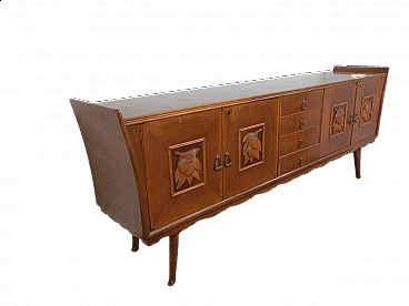 Credenza in legno di rovere intarsiato con disegno floreale. Dotata di 4 porte con ripiani all’interno e una cassettiera. Dotata di chiavi Schiena in compensato In buone condizioni