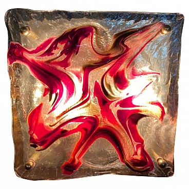 Una plafoniera prodotta in Italia negli anni '60 da La Murrina, in ottone e vetro di Murano rosso e oro. Funziona a 110-240 volt e necessita di normali lampadine e14.