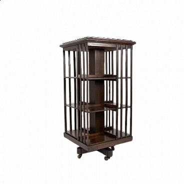 Libreria girevole in legno di quercia con ruote, anni '30.