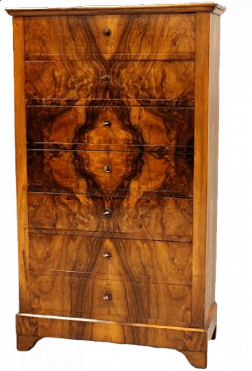 Settimanale in noce massello e lastronato in radica di noce, Luigi Filippo, '800. Restaurato e con certificato di autenticità.
