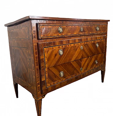 Cassettone Luigi XVI lastronato e intarsiato. Il fronte è scandito da tre cassetti e fianchi dritti impreziositi da filettature e intarsi in essenze pregiate. La lastronatura è disposta in obliquo, a spina di pesce, a formare sia sui fianchi che il piano e il fronte delle specchiature contrapposte e bordure decorate da una doppia filettatura ad esaltare il contrasto delle varie essenze impiegate. Il cassettone è sorretto da piedi rastremati e troncopiramidali tipici del periodo. La fattura del cassettone lo colloca nell'ultimo quarto del 1700 in area lombarda. Il mobile risulta in ottimo stato di conservazione, originale e integro.