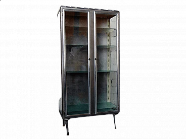 Vetrina medica anni '60 con struttura in ferro e sportelli in alluminio e 4 scomparti con base di vetro, parzialmente restaurata.