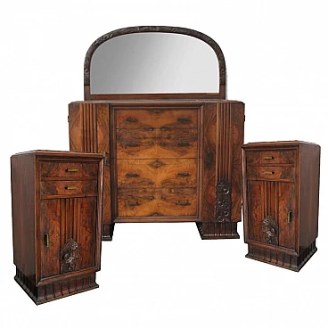 Set di comò con specchiera e comodini art decò, noce eradica di noce piano in marmo nero marquigna. Misure comò altezza 104 con specchiera 158 lunghezza 125 profondità 56, comodini altezza 75 larghezza 45 profondità 35