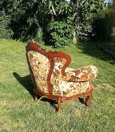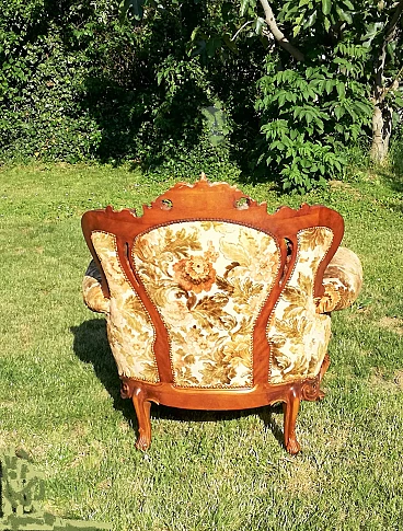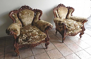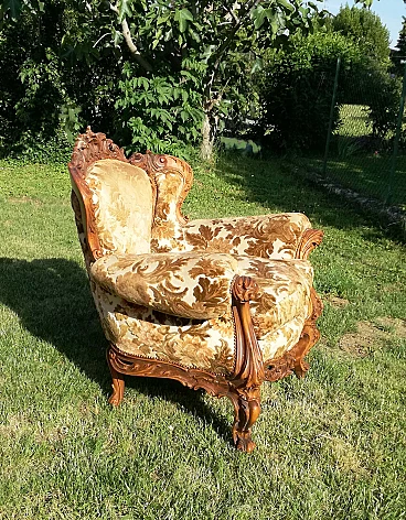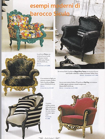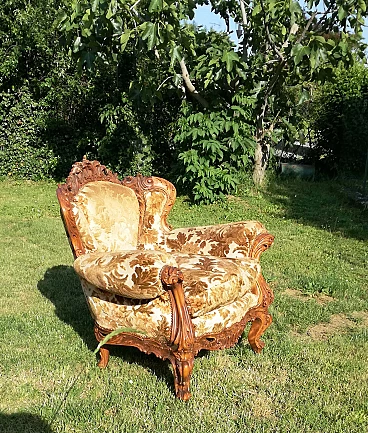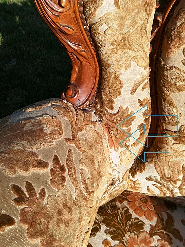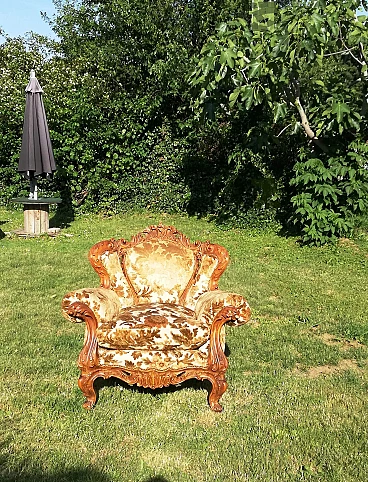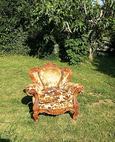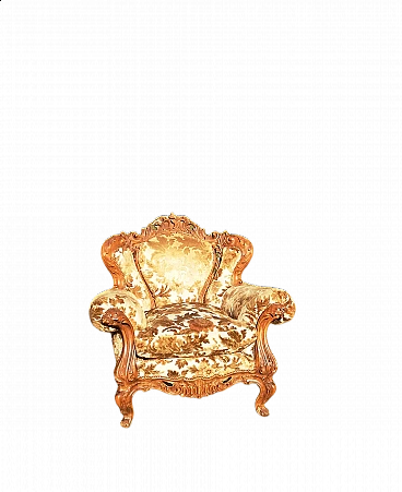 Poltrona , stile barocco Siciliano, originale anni 70, proviene da Palermo. Gusto e stile tipicamente Barocco, struttura in legno di ulivo con intagli a mano di altissimo livello artigianale. Tessuto Sanderson con disegni in velluto a rilievo e fili oro (rarissimo). presenta piccoli strappi nel tessuto . (vedi foto). per il resto e' in buono stato. sia i cuscini sotto che il fondo seduta sono rivestiti dello stesso tessuto, che eventualmente si può recuperare per sistemare lo strappo.