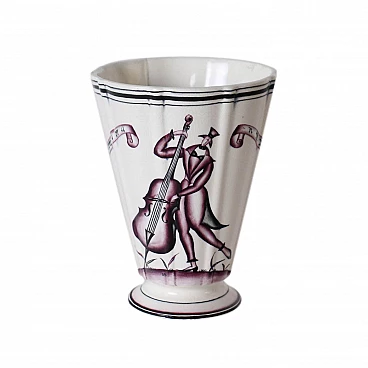 Vaso in ceramica smaltata di Guido Andlovitz per la manifattura SCI di Laveno. Sotto la base marchio della manifattura, della quale Andlovitz assunse la direzione nel 1923. Il decoro, vicino alle linee di Gio Ponti, sottolinea l'amicizia e rivalità con il grande architetto.