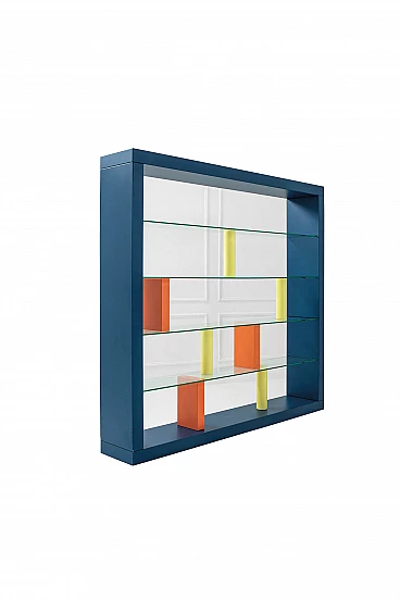 Libreria modello "Giorno" disegnata da Ettore Sottsass e prodotta da Schopenauer (Fontana Arte) nel 1993 con struttura in legno laccato e cristallo molato. Condizioni vintage buone. Sul bordo di un piano in vetro sbeccatura di circa 2 cm. Sulla struttura in legno sui bordi sbeccature con mancanza di smaltatura blu. cm 205x241x40. L. Falconi, Fontana Arte. Una storia trasparente, Milano, 1998, p. 223.