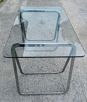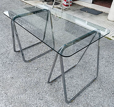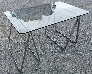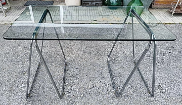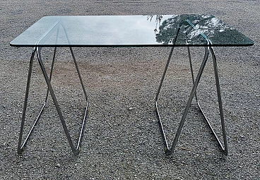 Tavolo con piano in cristallo e cavalletti cromati, anni '90