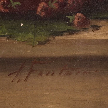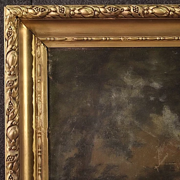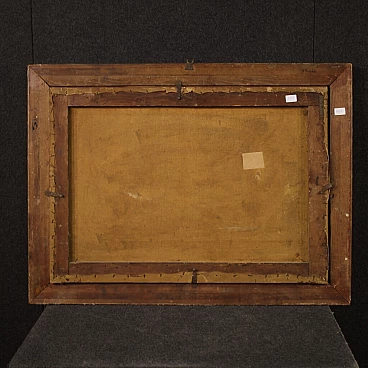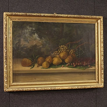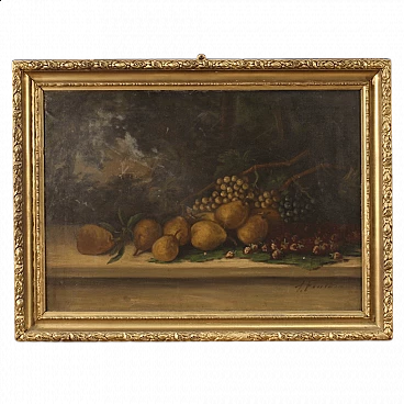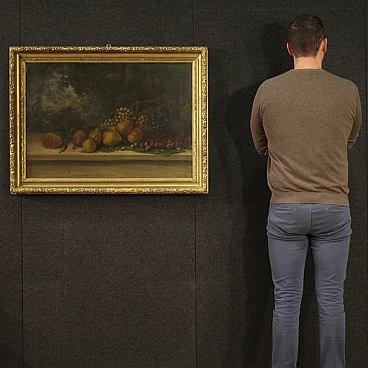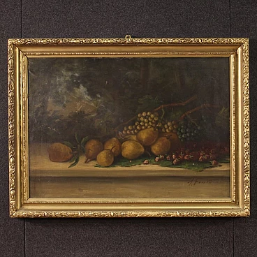 Dipinto italiano della prima metà del XX secolo. Opera olio su tela raffigurante natura morta con frutta di buona mano pittorica. Quadro di bella misura e piacevole arredamento adornato da cornice in legno e gesso scolpita e dorata (tinta bronzo) con alcuni segni del tempo e piccole cadute di decoro (vedi foto). Opera firmata in basso a destra (vedi foto) firma in fase di studio. Dipinto che si sviluppa in orizzontale, di bella decorazione, ideale da inserire in un salone o salotto. Tela che ha subito un intervento di restauro conservativo, rintelo e ripresa del colore in alcuni punti (vedi foto). Dipinto che presenta un alone in alto a sinistra (vedi foto), da restaurare. In discrete condizioni con qualche segno del tempo. Luce dipinto H 60 x L 86 cm.