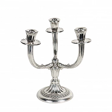 Candelabro in argento a tre fiamme con decori a baccellature e motivi vegetali. Marchio dell'argento incusso sotto la base mentre quello dell'argentiere poco decifrabile.