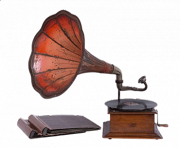 Grammofono in legno di rovere con tromba in latta. Funziona tramite manovella: girando la manovella è possibile ricaricare il riproduttore il quale propaga musica nella stanza attraverso l’imbuto a tromba. Non è funzionante (da revisionare) e con certificato di autenticità.