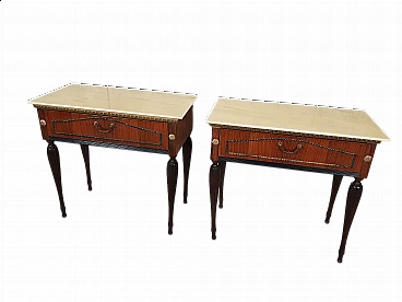 Coppia di comodini anni '50 di origine italiana con cassetto e piano in marmo bianco/panna. Ideali per ambienti moderni e antichi grazie alle loro forme e misure lineari. Da notare le gambe a spillo e le decorazioni nella parte frontale. Uno dei due presenti segni dovuti all'età e all'utilizzo sul piano di marmo.