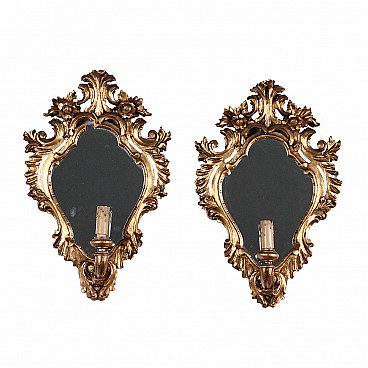 Coppia di ventoline in stile Barocchetto veneziano intagliate e dorate. I candelieri sono dotati di portaceri. Prodotto che a causa dell'età e dell'usura richiede interventi di restauro e ripresa della lucidatura.