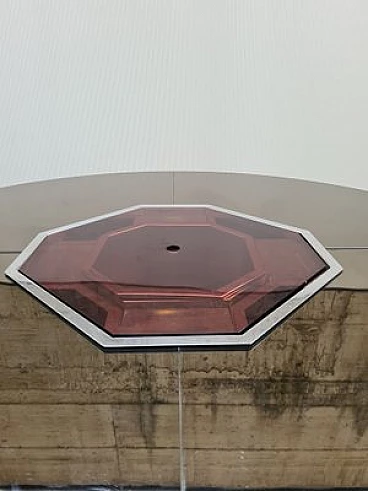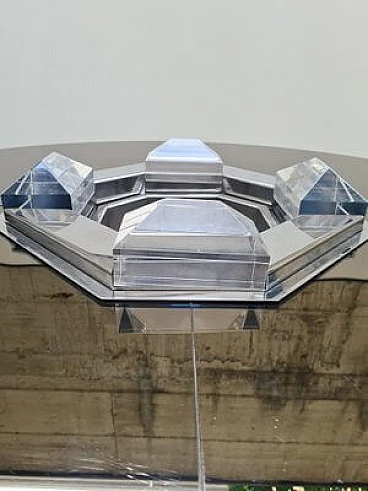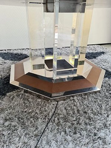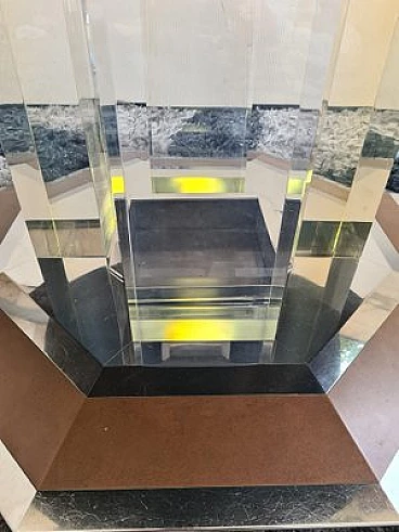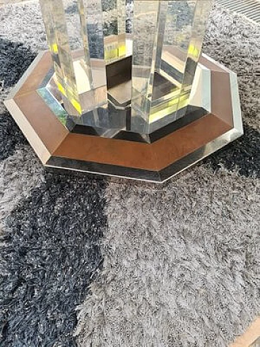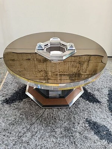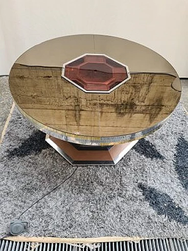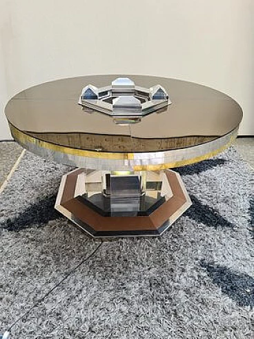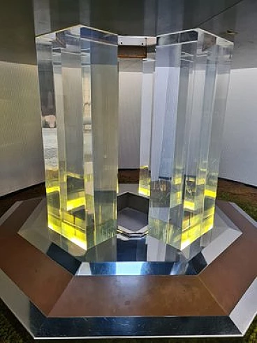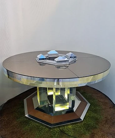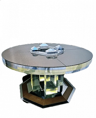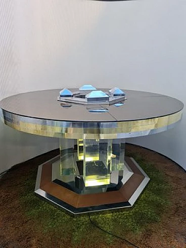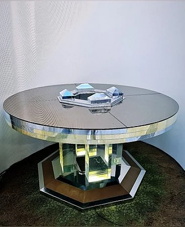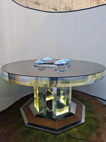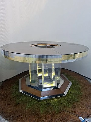 Tavolo da pranzo rotondo di Sandro Petti per Maison Jansen, Francia, anni Settanta. Da una base ottagonale in ottone e cromo, quattro enormi colonne si innalzano per sostenere l'imponente piano rotondo, illuminato da una luce al neon nascosta all'interno. L'apertura al centro offre la possibilità di aggiungere piante, oppure si può decorare con una corona formata da quattro piramidi o chiudere con un pannello. Sandro Petti è stato un architetto d'avanguardia che ha lavorato in esclusiva con artisti e designer come Romeo Rega ed Enrico Manera. Il suo lavoro è stato riconosciuto nel 1977 al Salone del Mobile con immagini su Casa Vogue.