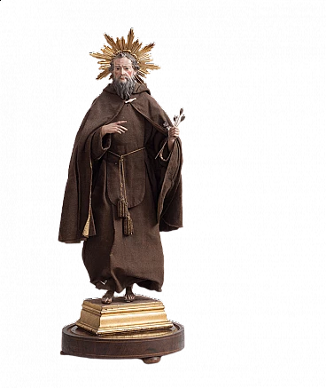 Figura di Santo Napoletano raffigurante San Ciro. Realizzato secondo la tradizione con mani e piedi in legno, testa in terracotta e occhi di cristallo. La finezza dell'intaglio, la cura dei dettagli fa chiaro riferimento alla cultura presepiale della seconda metà del XVIII secolo. Provenienza: Napoli fine XVIII secolo (1770/80) Misure: Altezza testa-piedi 55cm. Documento: Certificato di Autenticità.