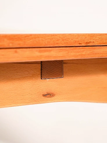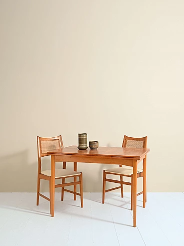 Tavolo da pranzo anni ’60 di manifattura scandinava. Il piano può essere allungato estraendo le due ali laterali. Dimensioni tavolo con ali: 160cm. Dimensioni tavolo senza ali: 103cm.