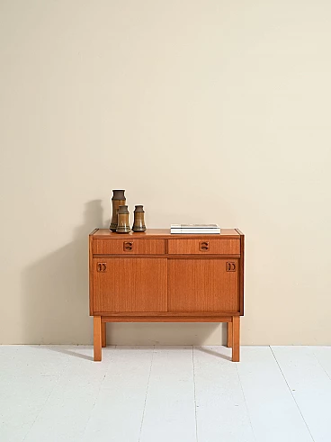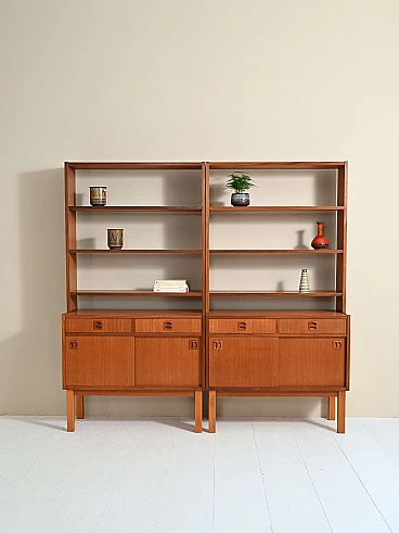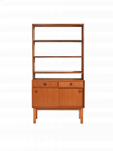 Originale mobile in teak di provenienza scandinava, formato da due parti. La parte superiore è una libreria dotata di scaffalature ad altezza regolabile, la parte inferiore è un mobiletto dotato di due cassetti e un vano con anta scorrevole. Ideale se si cerca in un’unica soluzione una libreria e uno spazio contenitore. Perfetta in sala ma anche in cucina o in camera da letto.