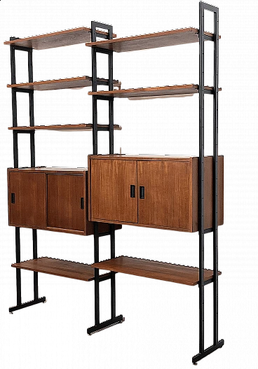 Libreria modulare a 2 campate degli anni '60, di manifattura italiana completamente restaurata e sanificata. La libreria è realizzata in teak ed è composta da 3 montanti in metallo con puntali in ottone regolabili, 7 mensole, 1 modulo con ante scorrevoli e ripiano interno, 1 modulo con ante apribili. Tutta la ferramenta è in ottone, gli elementi sono regolabili. Condizioni perfette. Misura: altezza montanti 202 cm; profondità moduli 37cm; larghezza totale 157 cm.